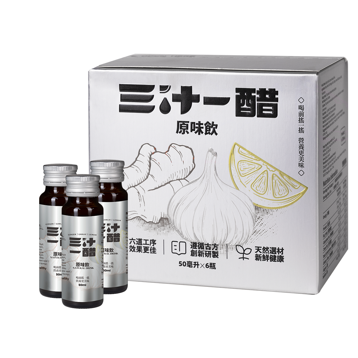 「三汁一醋」 由三種汁液:薑汁、蒜汁、檸檬汁再加醋製作而成,源於防病抗炎的食療古方。相關產品在中國、印度等民間流傳已久,被廣泛應用於防病養生、提升免疫力等保健功效。 我公司生產的【三汁一醋原味飲】依照「藥食同源」原理,在傳統製作基礎上重新組方,創新性增加發酵程序,提升薑、蒜、檸檬、醋之食療功效。並採用單獨炮製和酵化原理,大大降低薑、蒜、醋對胃壁刺激性,亦令產品更添口感清爽、不溫不躁的飲用效果。